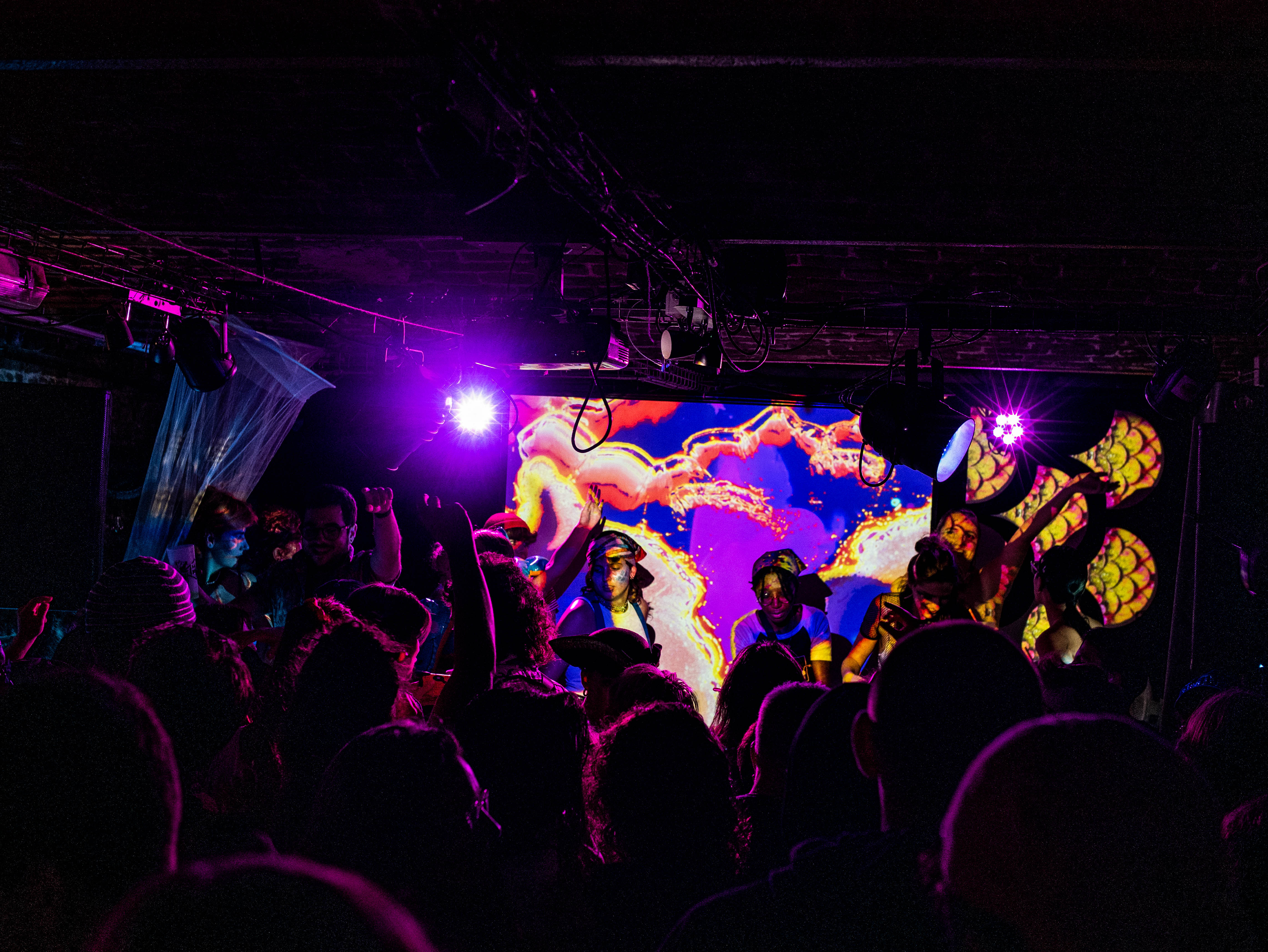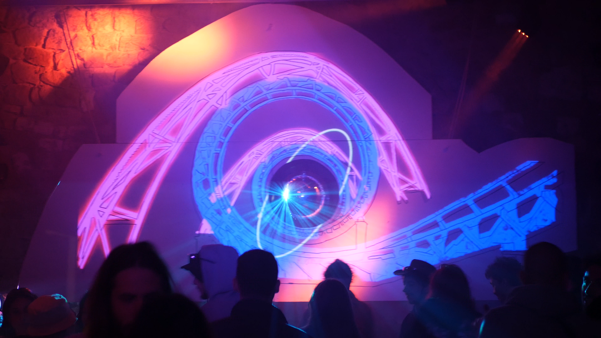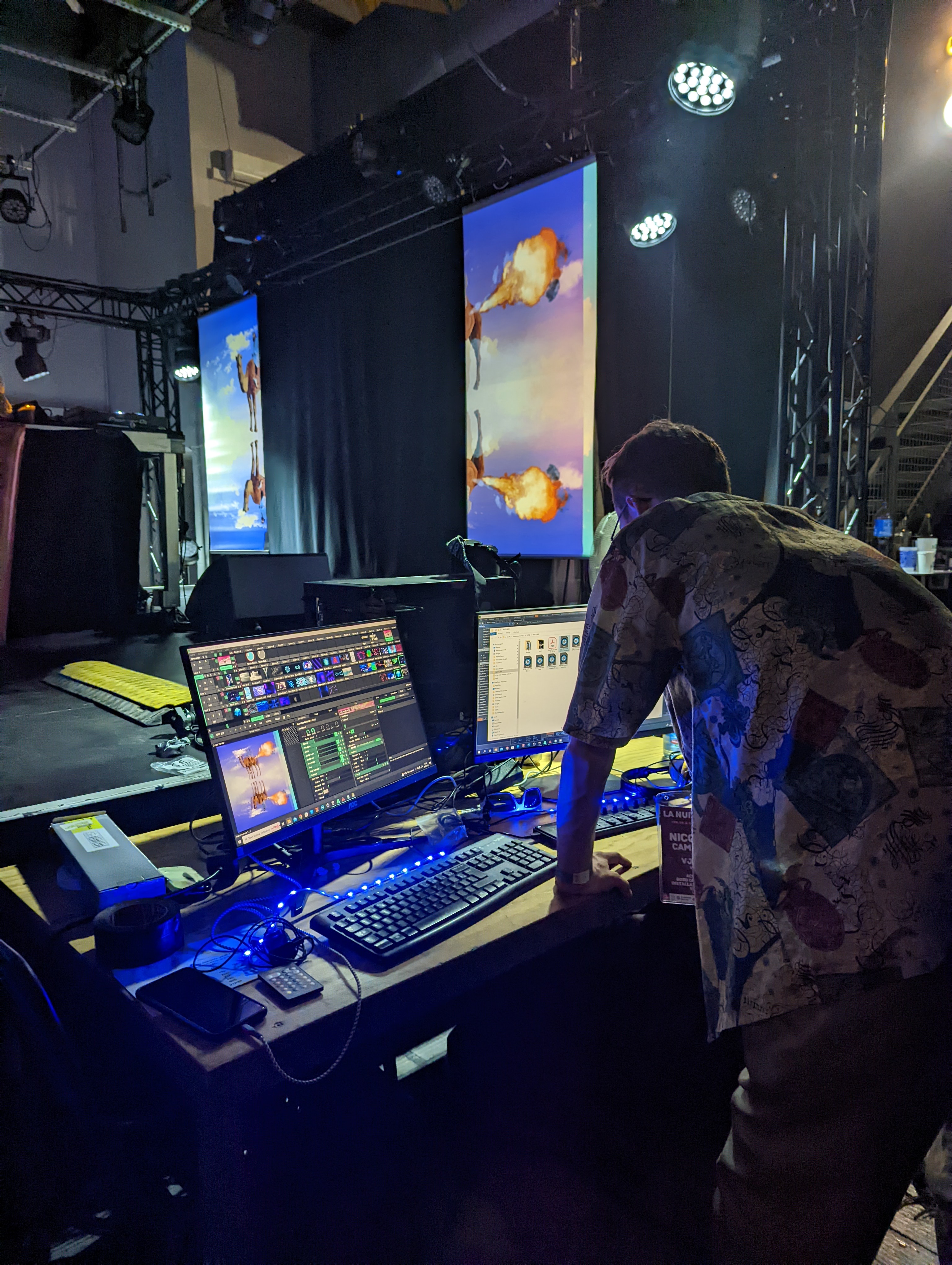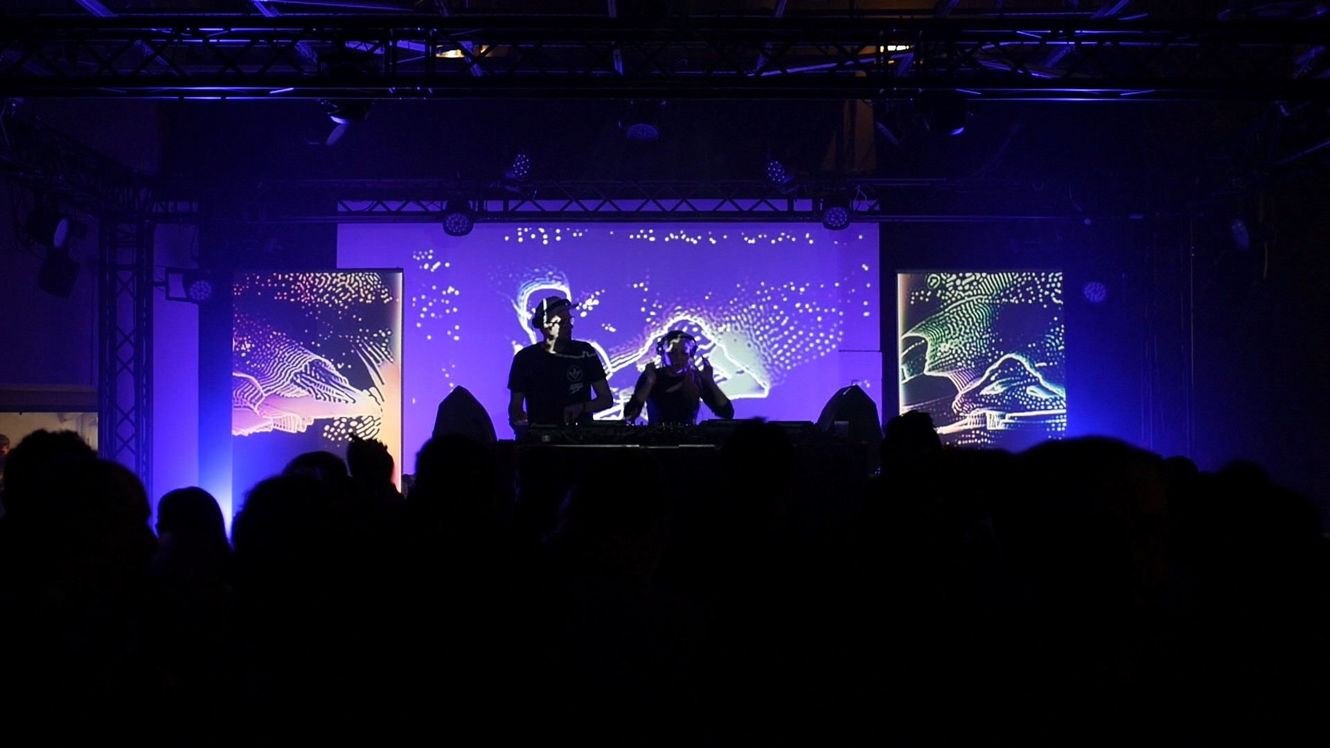Rendu en temps réel utilisant les silhouettes des artistes sur trois vidéoprojecteurs en simultané.